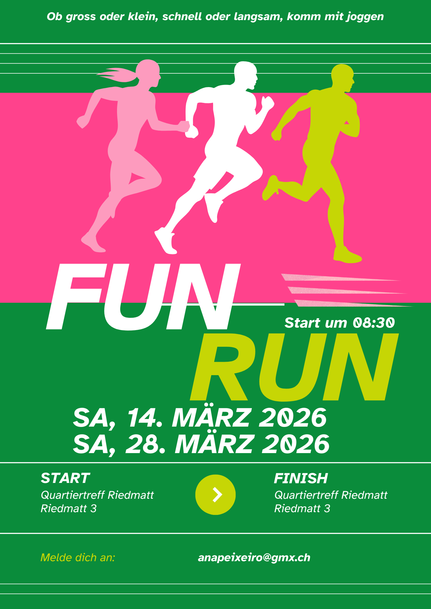 Wir treffen uns jeweils um 8.30 Uhr vor dem Quartiertreff Riedmatt und joggen von dort aus los. Ob Anfänger oder geübter Läufer – alle Niveaus sind herzlich willkommen!