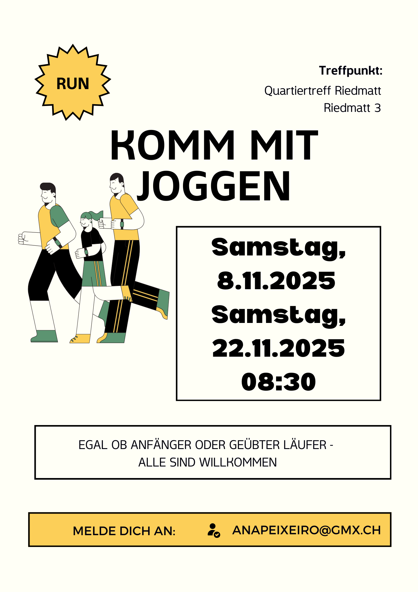 Wir treffen uns jeweils um 8.30 Uhr vor dem Quartiertreff Riedmatt und joggen von dort aus los. Ob Anfänger oder geübter Läufer – alle Niveaus sind herzlich willkommen!