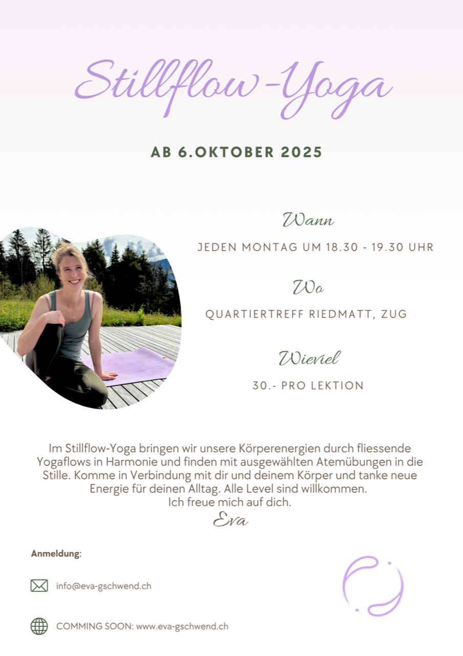 Im Stillflow-Yoga bringen wir unsere Körperenergien durch fliessende Yogaflows in Harmonie und finden mit ausgewählten Atemübungen in die Stille, kommen in Verbindung mit dir und deinem Körper und tanken neue Energie für deinen Alltag. Alle Levels sind herzlich willkommen.